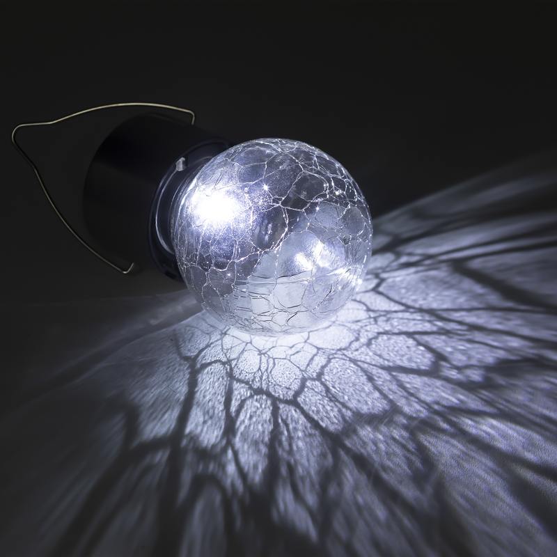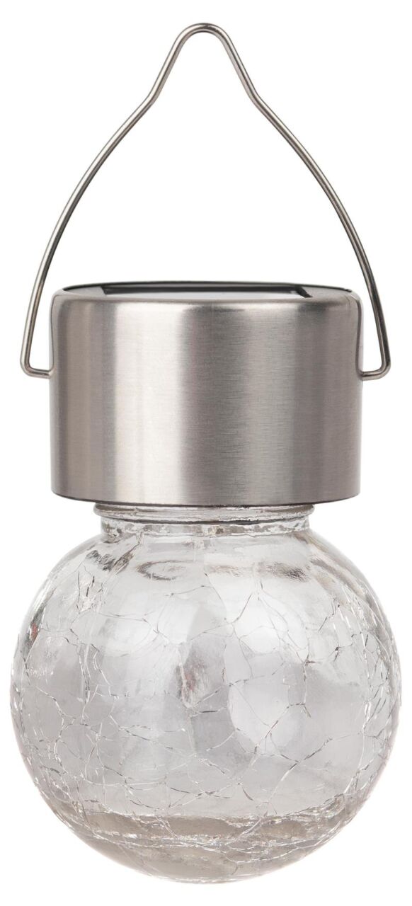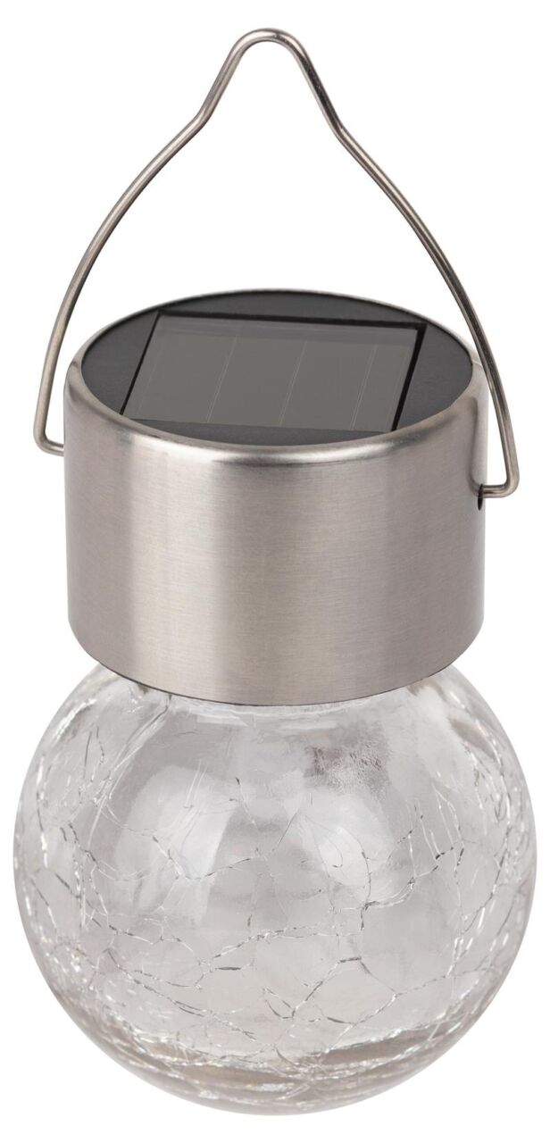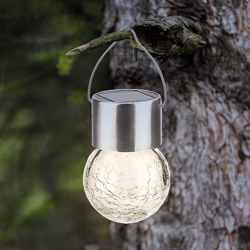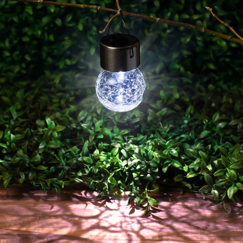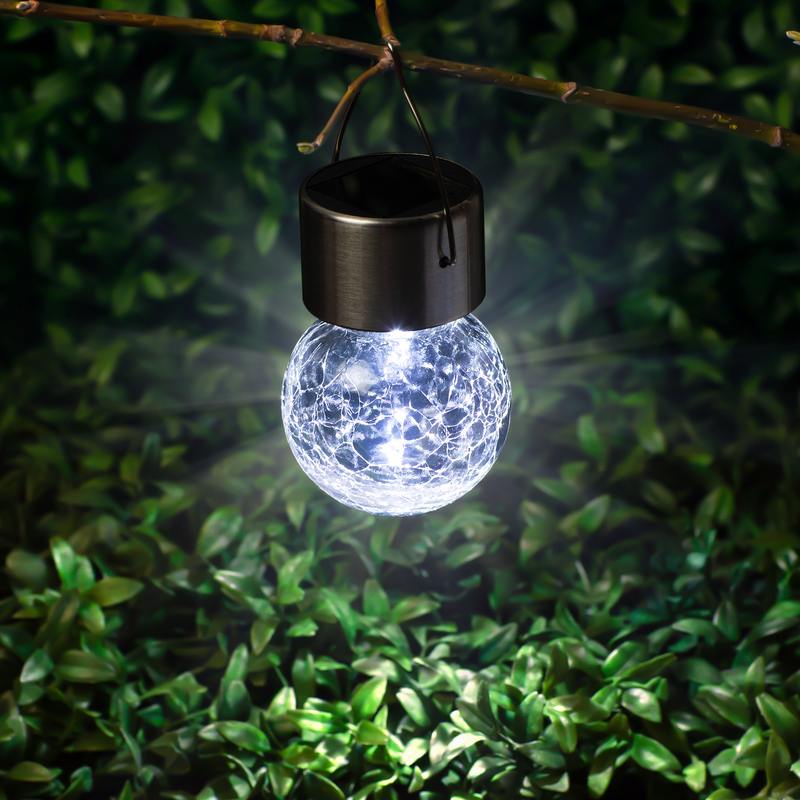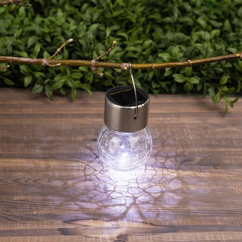 Подвесной светильник-ламочка с эффектом кракле ЭРА ERASF22-32 (арт. Б0053384). Диаметр светодиодного шара — 6 см. Металлическая ручка-подвес позволяет с комфортом применять данный уличный светильник. В дневное время садовый светильник подзаряжается естественным способом с помощью встроенной солнечной батареи, вечером автоматически включается, создаёт яркую дополнительную подсветку и красивый световой узор. Подвесная садовая LED-лампочка работает в любую погоду. Высокая защита от влаги и пыли — IP54. За счёт использования солнечной энергии для питания светильник ЭРА "Лампочка" можно размещать в любом уголке сада, перемещать с места на место.