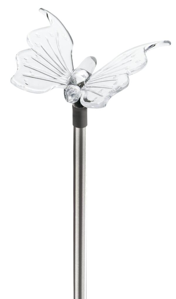 Светильник популярной модели на длинной стальной стойке, светящийся элемент в виде прозрачной фигурки. Две разные насадки: Бабочка + Стрекоза. Белый светодиод.