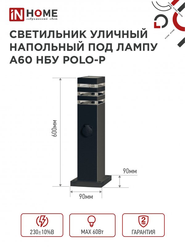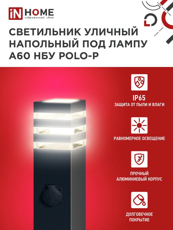 Характеристики Светильник уличный напольный НБУ POLO-SP600WO-A60-BL алюминиевый под лампу А60 Е27 600мм с розеткой черный IP54 IN HOME: