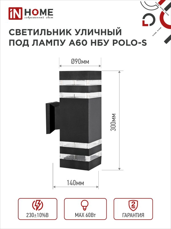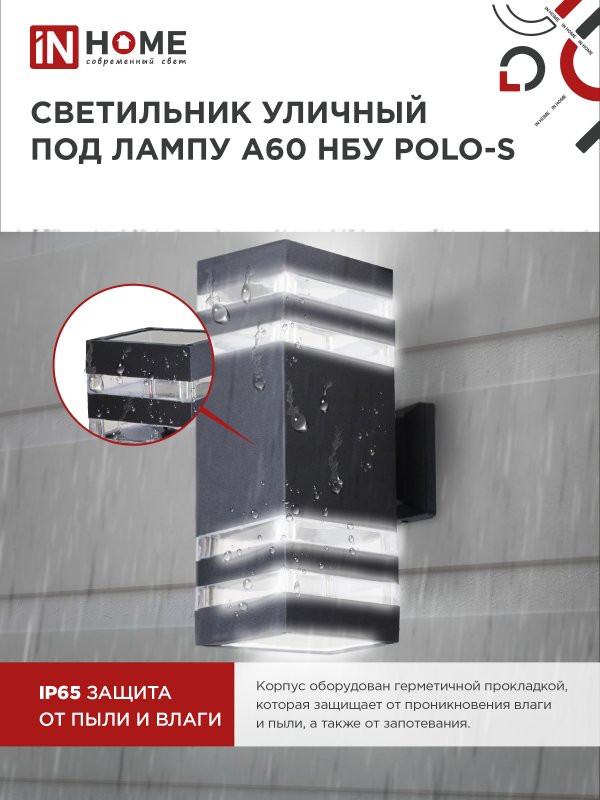 Характеристики Светильник уличный настенный двусторонний НБУ POLO-S-2хA60-BL-алюминиевый под лампу 2хA60 E27 черный IP54 IN HOME: