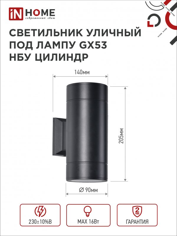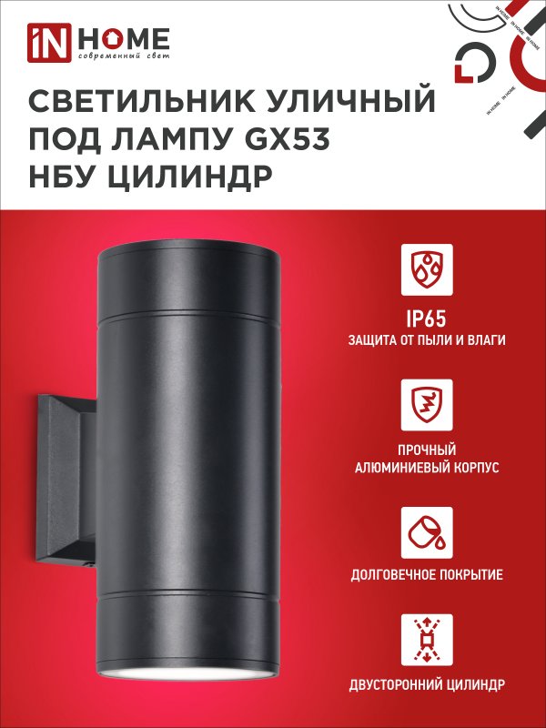 Назначение и применение Светильник уличный настенный двусторонний НБУ ЦИЛИНДР-2xGX53-BL алюминиевый под лампу 2хGX53 черный IP54 IN HOME