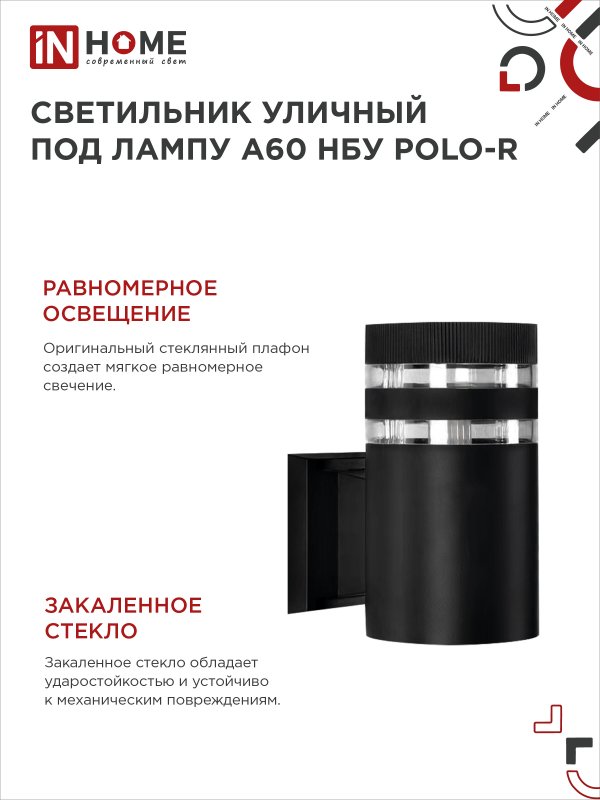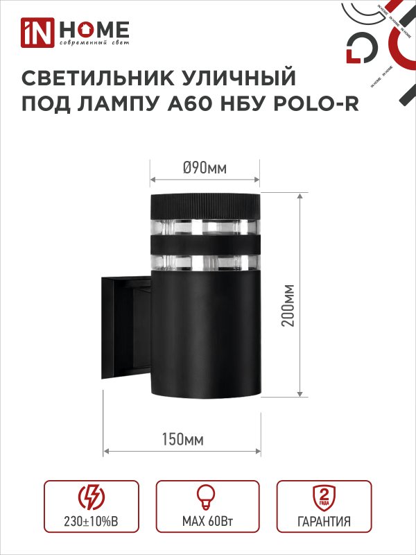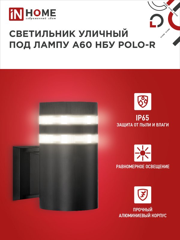 Характеристики Светильник уличный настенный односторонний НБУ POLO-R-1xA60-BL-алюминиевый под лампу 1xA60 E27 черный IP54 IN HOME: