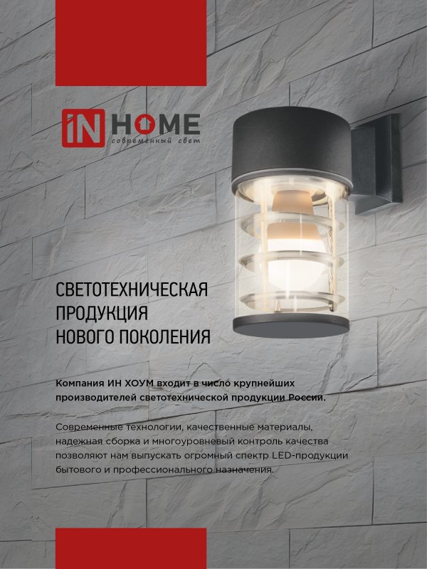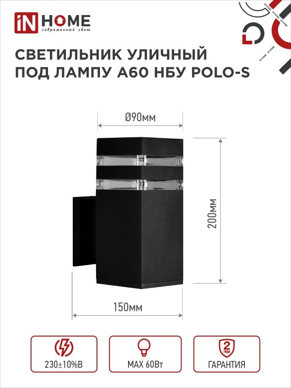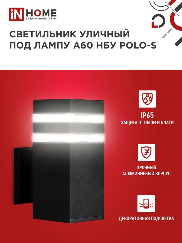 Характеристики Светильник уличный настенный односторонний НБУ POLO-S-1xA60-BL-алюминиевый под лампу 1xA60 E27 черный IP54 IN HOME:
