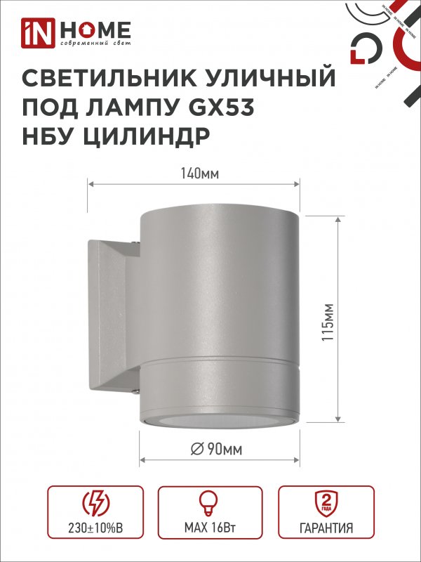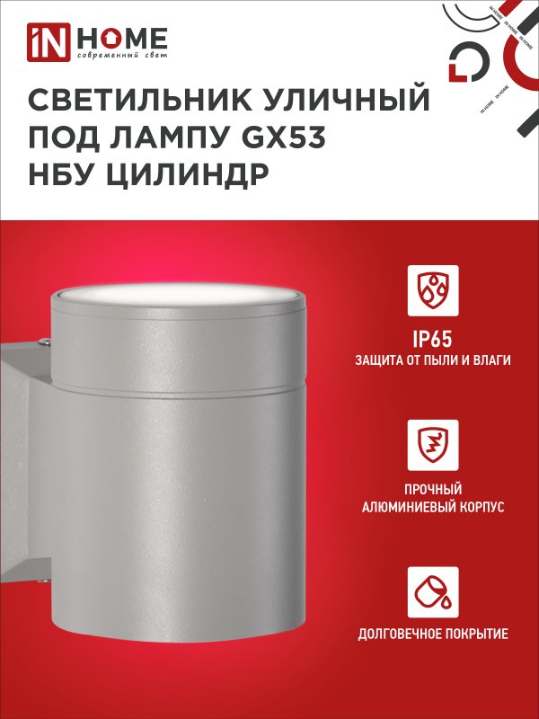 Характеристики Светильник уличный односторонний НБУ ЦИЛИНДР-1xGX53-GR алюминиевый под лампу 1хGX53 серый IP65 IN HOME: