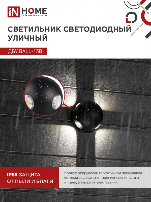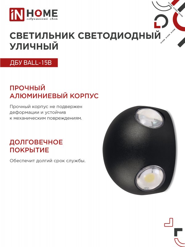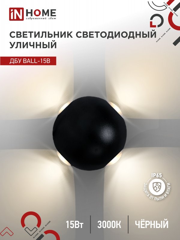 Характеристики Светильник уличный светодиодный ДБУ BALL-15B 15Вт 3000К IP65 черный IN HOME: