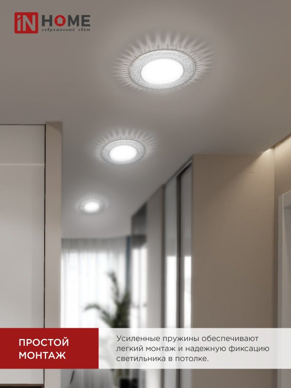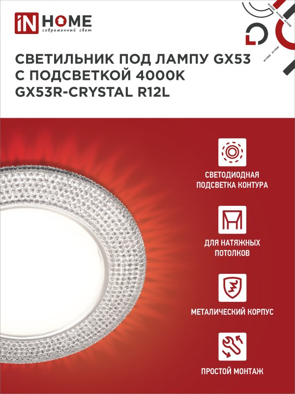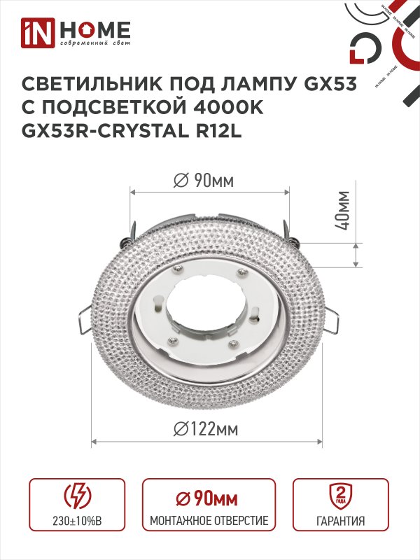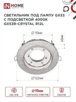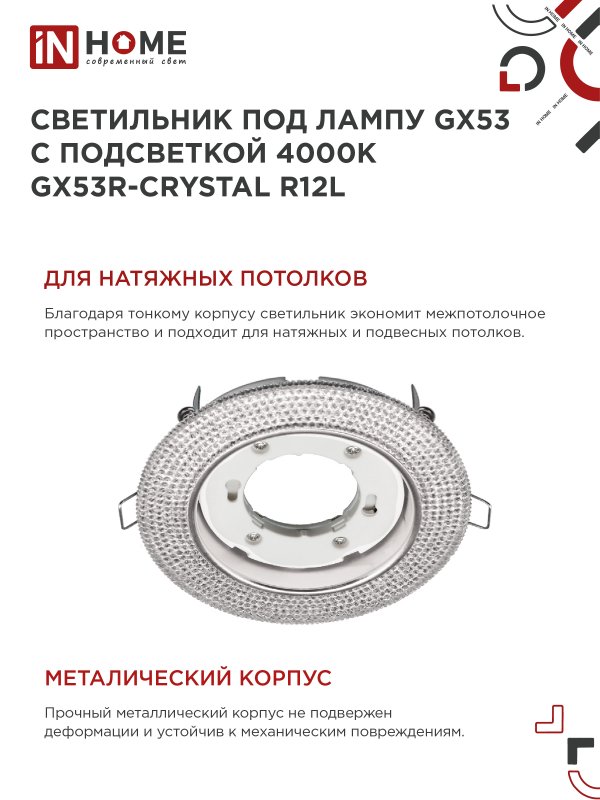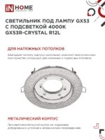 Характеристики Светильник встраиваемый GX53R-crystal R12L с подсветкой 4К под лампу GX53 Прозрачный/Хром IN HOME: