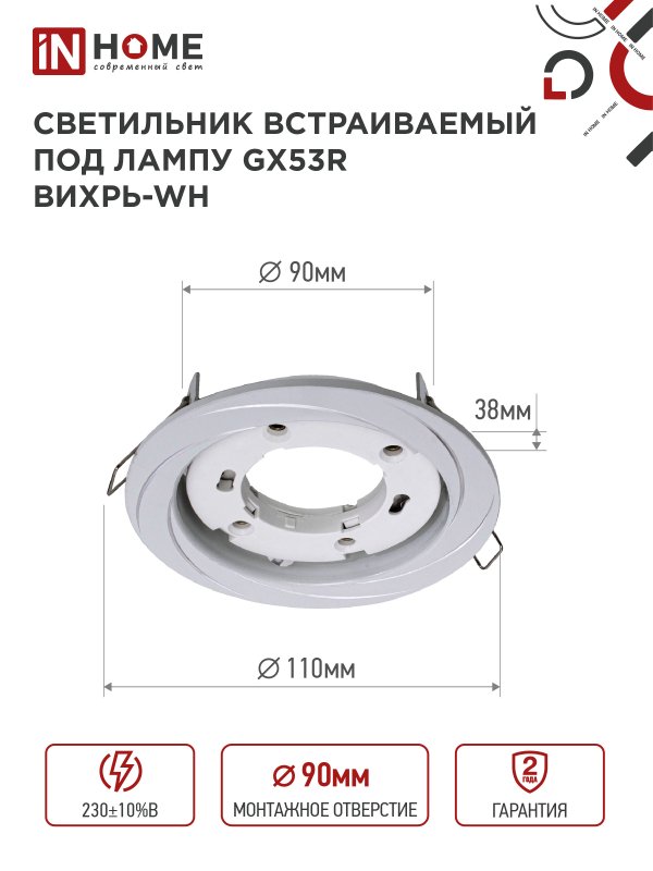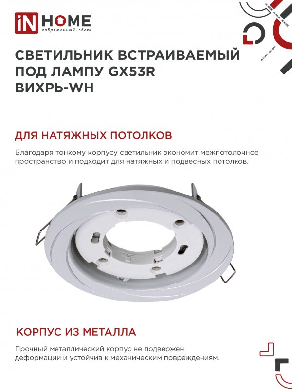 Характеристики Светильник встраиваемый GX53R-deco ВИХРЬ-WH под лампу GX53 белый IN HOME: