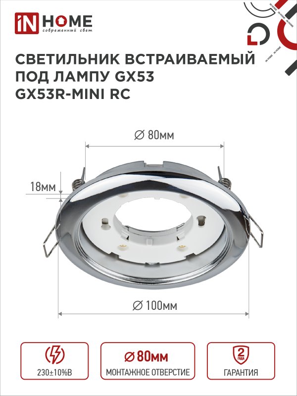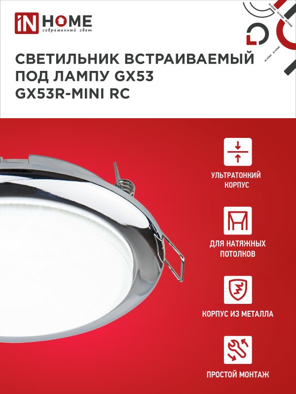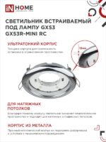 Характеристики Светильник встраиваемый GX53R-mini RC ультратонкий металл под лампу GX53 230В хром IN HOME: