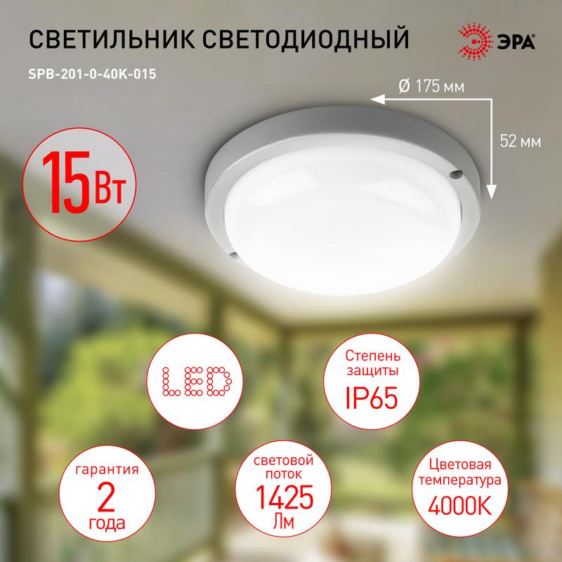Характеристики Светильник ЖКХ светодиодный ЭРА SPB-201-0-40K-015 IP65 15Вт 1425Лм 4000К D175 КРУГ: