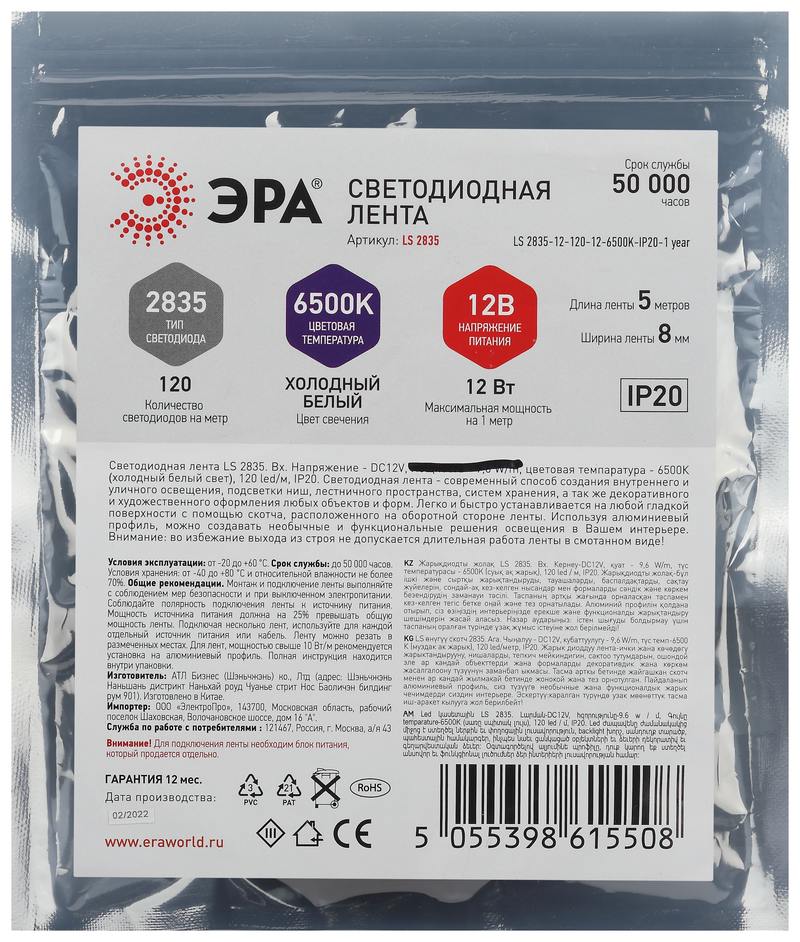 Характеристики Светодиодная лента ЭРА LS2835 12-120-12-6500K-IP20-1 year 5м холодный белый свет: