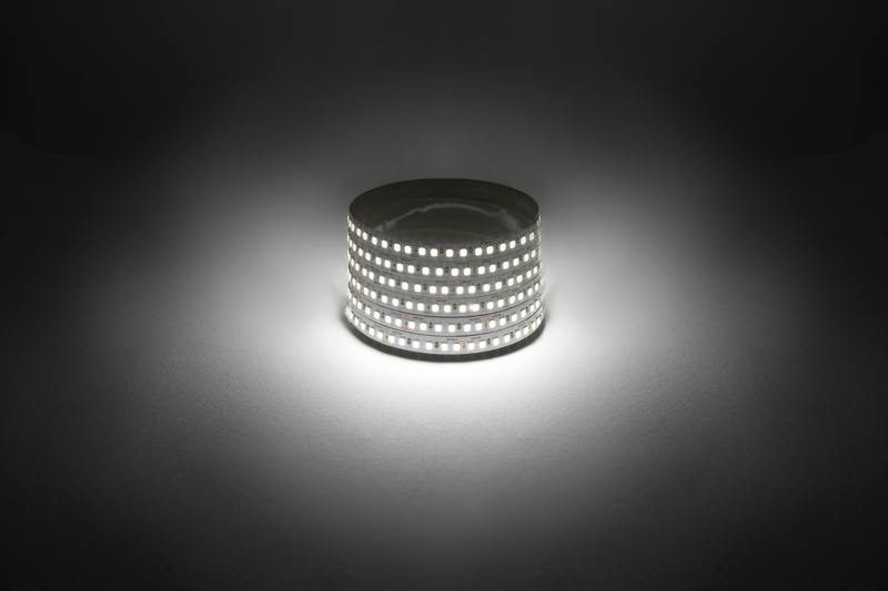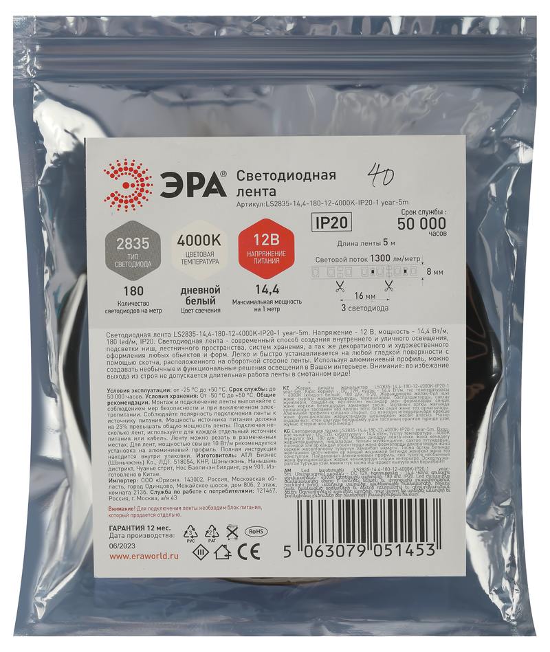 Светодиодная лента LS2835-14,4-180-12-4000K-IP20-1 year-5m со степенью защиты от пыли и влаги IP20 — современный способ создания внутреннего освещения, подсветки ниш, лестничного пространства, систем хранения, а также декоративного и художественного оформления любых объектов и форм. Легко и быстро устанавливается на любой гладкой поверхности с помощью скотча, расположенного на оборотной стороне ленты. Используя алюминиевый профиль, можно создавать необычные и функциональные решения освещения в Вашем интерьере. Рабочее напряжение ленты составляет 12 В, а мощность равна 14,4 Вт/м. Светодиодная лента обладает световым потоком 1300 лм/м с дневным белым цветом свечения (4000К).