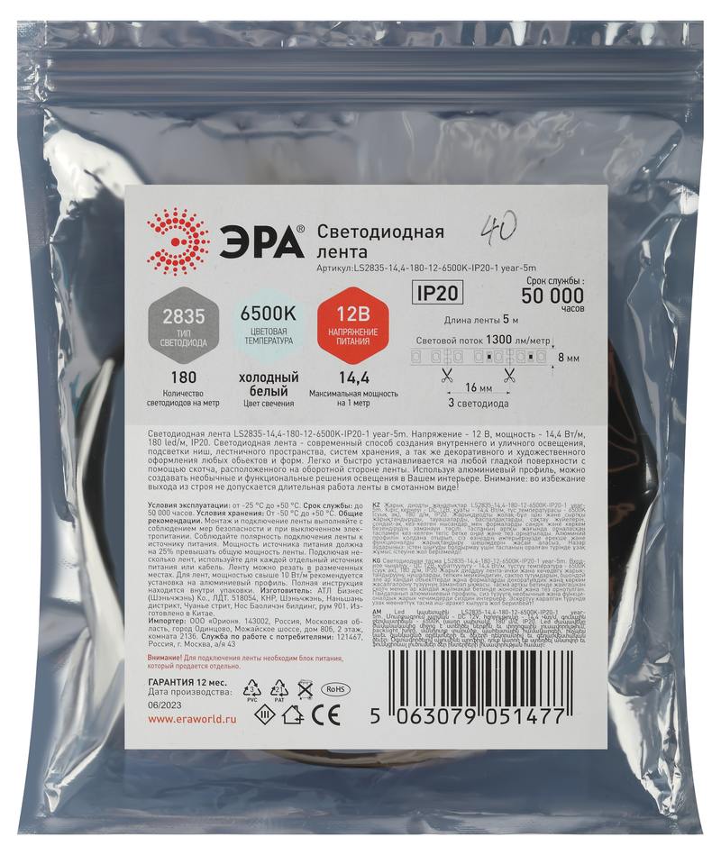 Светодиодная лента LS2835-14,4-180-12-6500K-IP20-1 year-5m со степенью защиты от пыли и влаги IP20 — современный способ создания внутреннего освещения, подсветки ниш, лестничного пространства, систем хранения, а также декоративного и художественного оформления любых объектов и форм. Легко и быстро устанавливается на любой гладкой поверхности с помощью скотча, расположенного на оборотной стороне ленты. Используя алюминиевый профиль, можно создавать необычные и функциональные решения освещения в Вашем интерьере. Рабочее напряжение ленты составляет 12 В, а мощность равна 14,4 Вт/м. Светодиодная лента обладает световым потоком 1300 лм/м с холодным белым цветом свечения (6500К).