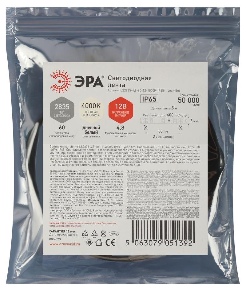 Характеристики Светодиодная лента ЭРА LS2835 -4,8-60-12-4000K-IP65-1 year-5m дневной белый 5м: