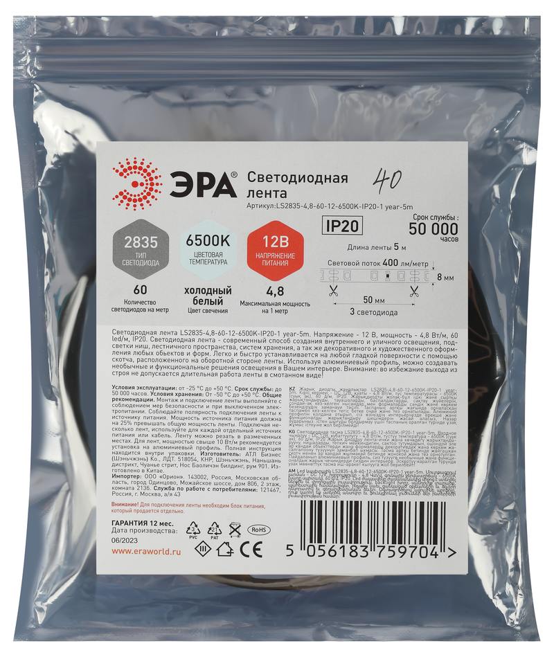 Характеристики Светодиодная лента ЭРА LS2835 -4,8-60-12-6500K-IP20-1 year-5m: