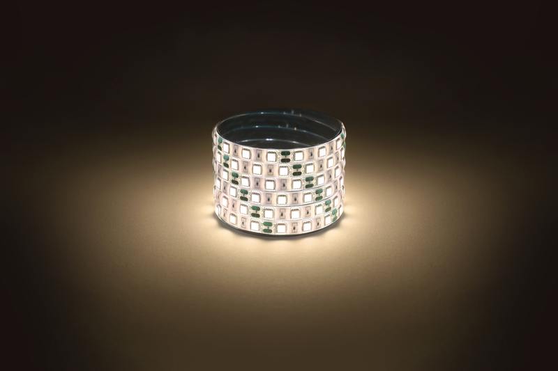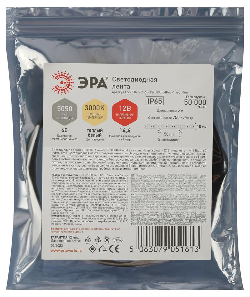 Светодиодная лента LS5050-14,4-60-12-3000K-IP65-1 year-5m со степенью защиты от пыли и влаги IP65 — современный способ создания внутреннего освещения, подсветки ниш, лестничного пространства, систем хранения, а также декоративного и художественного оформления любых объектов и форм в помещениях с повышенным уровнем влажности и уличного освещения. Легко и быстро устанавливается на любой гладкой поверхности с помощью скотча, расположенного на оборотной стороне ленты. Используя алюминиевый профиль, можно создавать необычные и функциональные решения освещения в Вашем интерьере. Рабочее напряжение ленты составляет 12 В, а мощность равна 14,4 Вт/м. Светодиодная лента обладает световым потоком 750 лм/м с теплым белым цветом свечения (3000К).