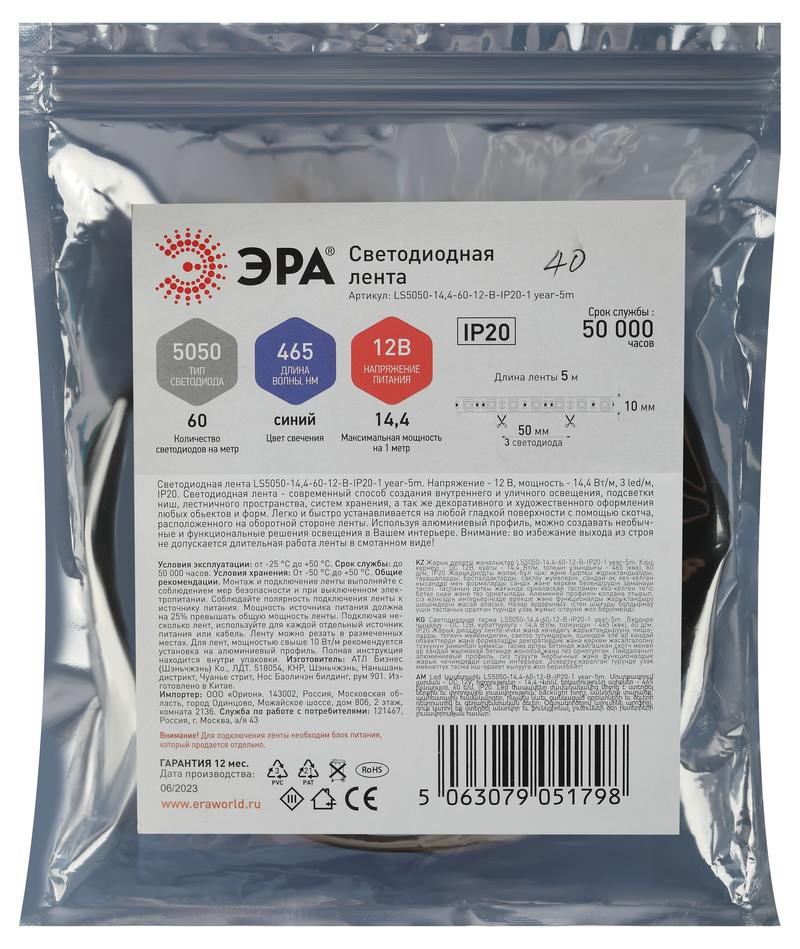 Характеристики Светодиодная лента ЭРА LS5050 -14,4-60-12-B-IP20-1 year-5m синий 5м: