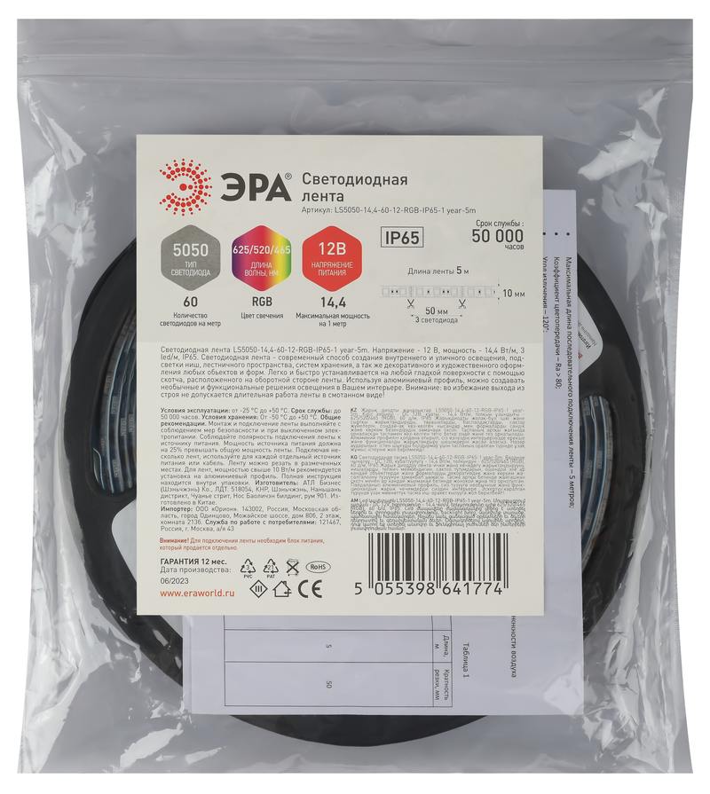 Характеристики Светодиодная лента ЭРА LS5050 -14,4-60-12-RGB-IP65-1 year-5m: