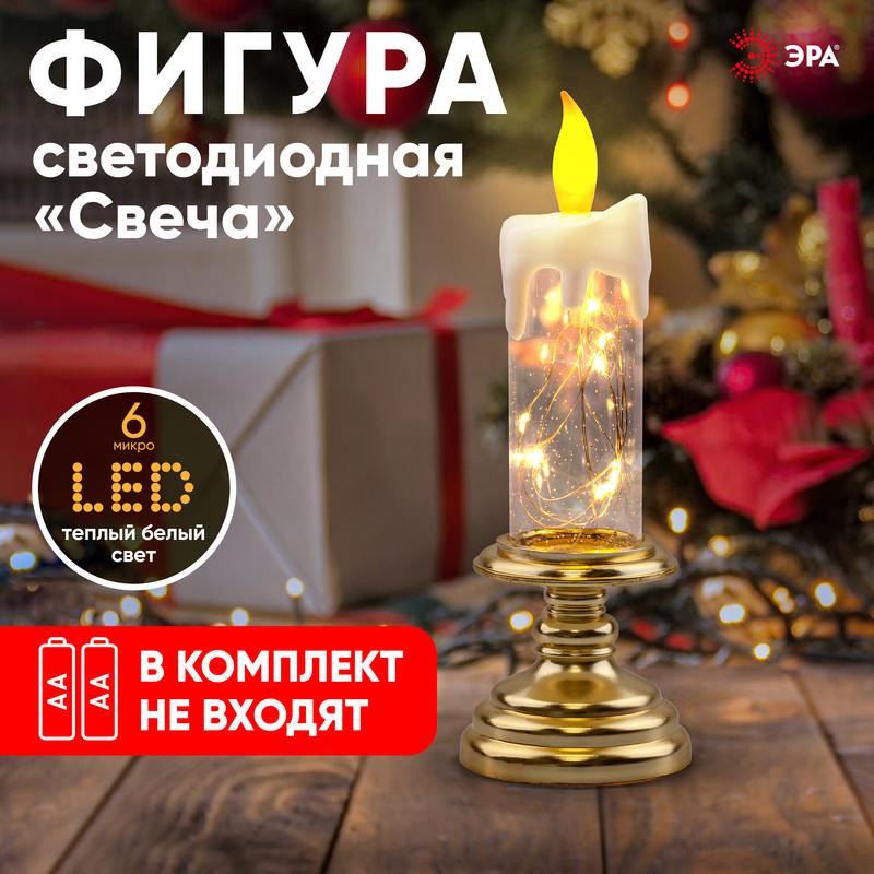 Светодиодный светильник EGNDS-03 "Свеча" (арт. Б0051934) от бренда ЭРА высотой 20 см с уютным теплым светом создаст атмосферу праздника и волшебства у вас дома. В отличие от обычных свечей, декоративная светодиодная свеча абсолютно безопасна и станет достойным украшением стола в новогоднюю ночь! Светильник работает от 2 батареек AAA и имеет класс защиты IP20 (рекомендуется использовать внутри помещений). Фигура выполнена в виде свечи с прозрачным корпусом, внутри которого находится мини гирлянда из 10 лампочек. Этот настольный зимний светильник — прекрасный подарок для близких на Новый год и Рождество. Такой новогодний декор для дома всегда дарит невероятное ощущение праздника!