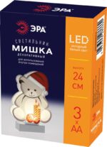 Фигура светодиодная новогодняя ЭРА EGNDS-07 "Мишка" (арт. Б0051931) высотой 24 см с рассеянным холодным светом подарит Вашему дому уютную атмосферу. Этот декоративный светильник украсит любую комнату, включая спальню: приглушенный свет позволяет использовать его в качестве ночника в детской. Светильник работает от 3 батареек AA и имеет класс защиты IP20 (рекомендуется использовать внутри помещений). Настольный зимний светильник в виде мишки в колпаке с новогодними шариками и свечами — это отличный подарок на Новый год и Рождество, особенно для ребенка. Такой новогодний декор для дома всегда создает чудесное праздничное настроение!