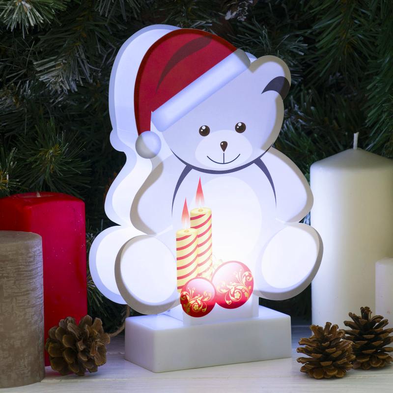 Фигура светодиодная новогодняя ЭРА EGNDS-07 "Мишка" (арт. Б0051931) высотой 24 см с рассеянным холодным светом подарит Вашему дому уютную атмосферу. Этот декоративный светильник украсит любую комнату, включая спальню: приглушенный свет позволяет использовать его в качестве ночника в детской. Светильник работает от 3 батареек AA и имеет класс защиты IP20 (рекомендуется использовать внутри помещений). Настольный зимний светильник в виде мишки в колпаке с новогодними шариками и свечами — это отличный подарок на Новый год и Рождество, особенно для ребенка. Такой новогодний декор для дома всегда создает чудесное праздничное настроение!