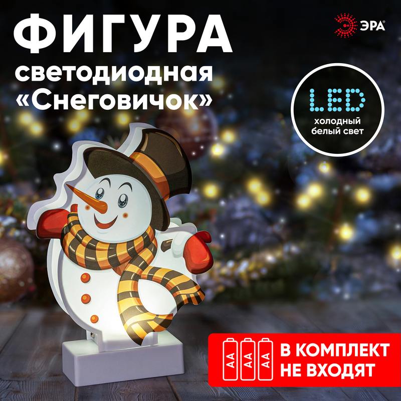 Фигура светодиодная праздничная ЭРА EGNDS-08 "Снеговичок" (арт. Б0051932) высотой 24 см с рассеянным холодным светом подарит Вашему дому неповторимую атмосферу уюта. Этот симпатичный декоративный светильник станет украшением любой комнаты, включая спальню: приглушенный свет позволяет использовать его в качестве ночника в детской. Светильник работает от 3 батареек AA и имеет класс защиты IP20 (рекомендуется использовать внутри помещений). Настольный зимний светильник в виде снеговика с улыбкой, в шарфе и варежках — это необычный подарок для ребенка на Новый год и Рождество. Новогодний декор для дома всегда создает чудесное праздничное настроение!