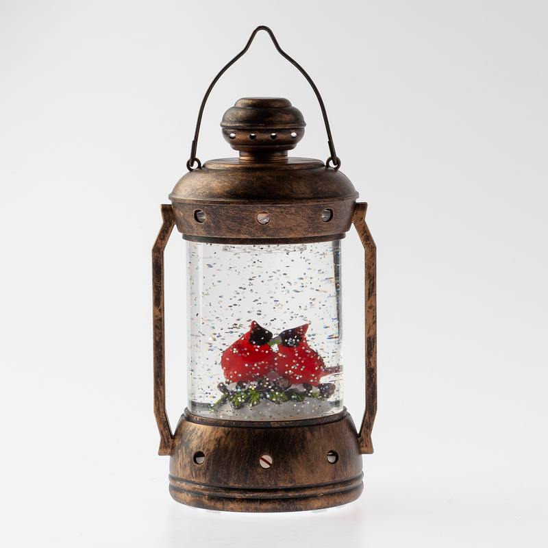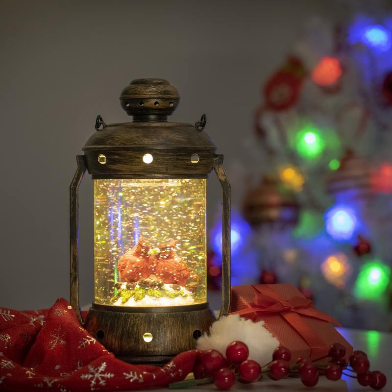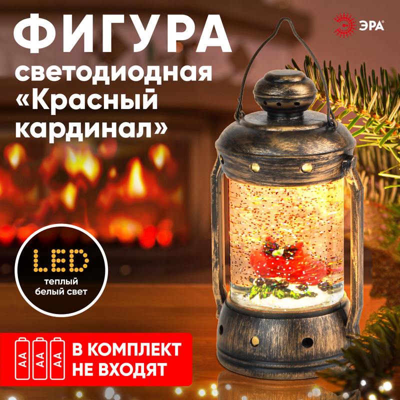 Новогодний светодиодный светильник ЭРА ENGDS-12 "Красный кардинал" высотой 18 см (арт. Б0051944) создаст у Вас дома праздничную атмосферу! Светильник-фонарик выполнен из ПВХ и окрашен под медь, внутри стекла расположены блестки, создающие эффект падающего снега. Внутри фонаря находятся фигурки двух красных кардиналов, они подсвечиваются 1 светодиодной лампочкой сверху. Декоративный светильник работает от 3 батареек АА, степень защиты IP20 (рекомендуется использовать в помещениях), автоматическое отключение через 6 часов. Он станет прекрасным украшением кухни, гостиной, а еще его можно использовать в спальне как ночник. Настольный винтажный фонарь — это необычный подарок на Новый год или Рождество, который понравится взрослым и детям. Новогодний декор для дома всегда поднимает настроение!