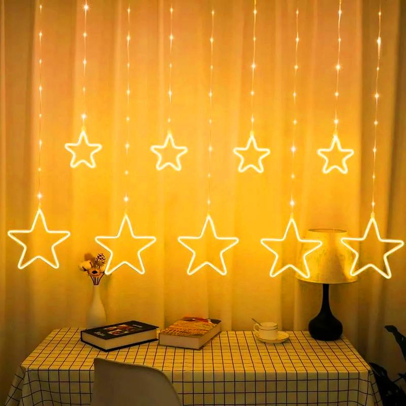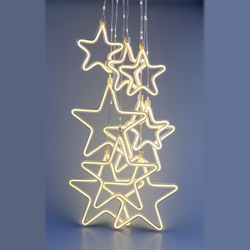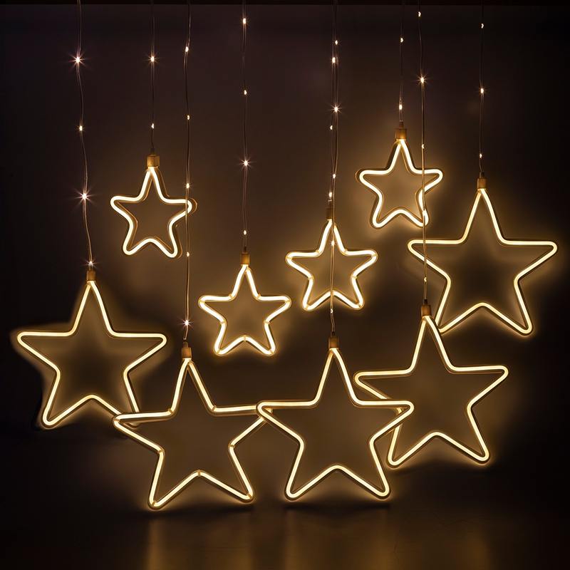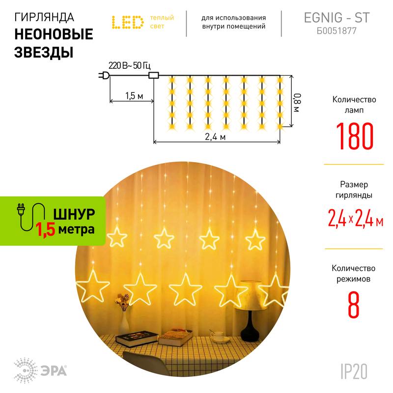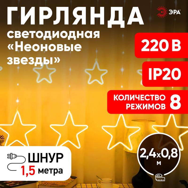 Характеристики Светодиодная новогодняя гирлянда ЭРА ЕGNIG — ST занавес Неоновые звезды 8 режимов 2,4*0,8 м теплый свет IP20: