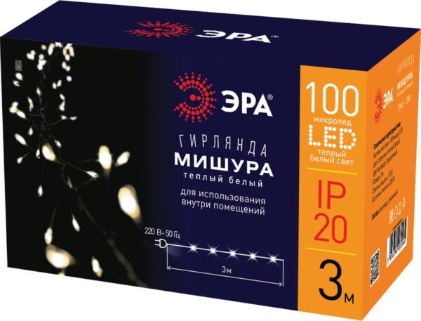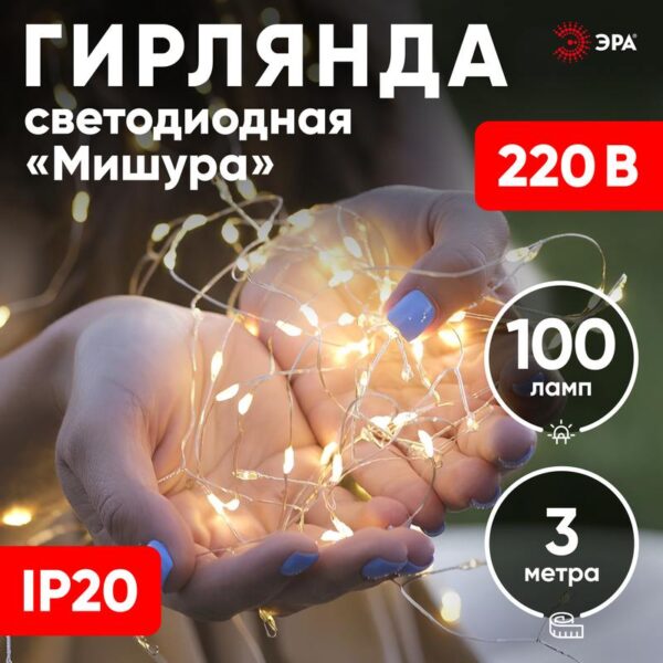 Характеристики Светодиодная новогодняя гирлянда ЭРА ЕNIG — 100M нить Мишура 3 м теплый белый 150 microLED 220 V:
