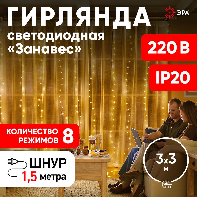 Характеристики Светодиодная новогодняя гирлянда ЭРА ЕNIG — 400W Занавес 8 режимов 3*3 м теплый белый 400 LED IP20: