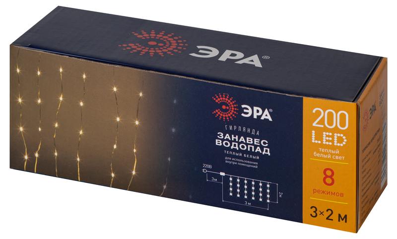 Характеристики Светодиодная новогодняя гирлянда ЭРА ENIN-200WL занавес водопад теплый белый 3*2 м 200 LED IP20: