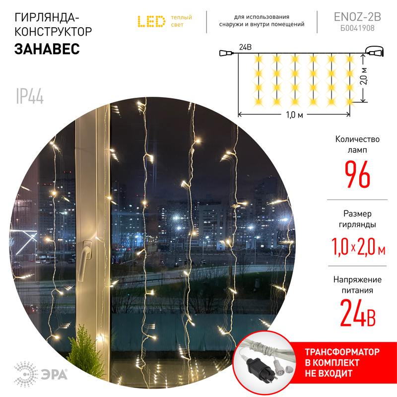 Праздничная светодиодная гирлянда ЭРА "Занавес" для использования внутри и снаружи помещений. Защищена от влаги и пыли (IP44), морозостойка — можно использовать на улице в регионах с низкими температурами. Идеальное решение для украшения окон, имеет оптимальные размеры: 2 х 2 м. На полупрозрачных малозаметных проводах размещены 96 ярких экономичных светодиодов с уютным тёплым светом. Стильная аккуратная гирлянда ЭРА "Занавес" создаёт позитивное настроение и незабываемую атмосферу в доме, офисе, общественном пространстве. Применяется для новогодней иллюминации, оформления праздников, дизайна фотозон. Ещё одно преимущество — специальный разъём для сопряжения с другими гирляндами. Такая модульная конструкция позволяет соединять в единую цепь до 5 гирлянд ЭРА "Занавес", формируя длинный световой ряд для максимально эффектной иллюминации. Современная светодиодная технология экономит до 90% электроэнергии. Гирлянда отвечает требованиям пожарной безопасности, работает от трансформатора. Трансформатор ЭРА, преобразующий входное напряжение 210-240 вольт в выходное 24 В: http://www.eraworld.ru/catalog/2647679