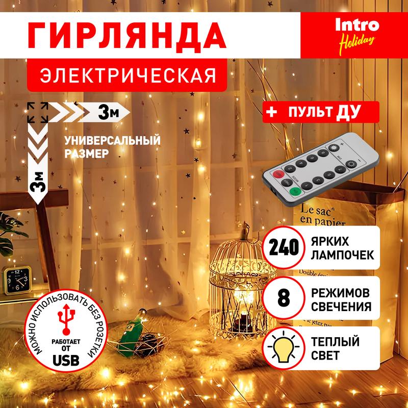 Характеристики Светодиодная новогодняя гирлянда Intro Holiday INZR-01 занавес 3*3 м теплый белый 240 microled USB: