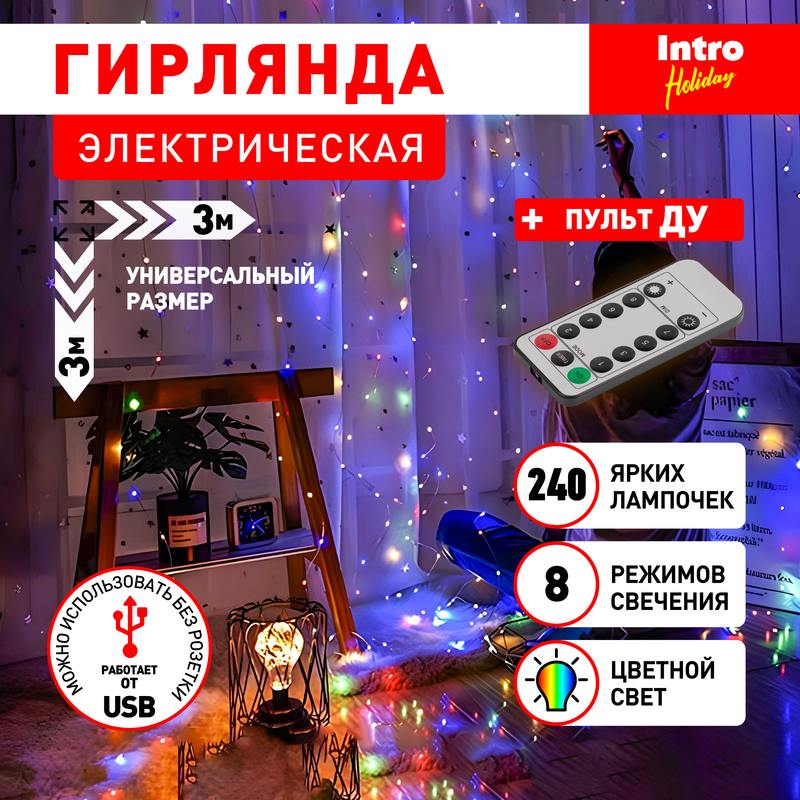 Характеристики Светодиодная новогодняя гирлянда Intro Holiday INZR-02 занавес 3*3 м мультиколор 240 microled USB: