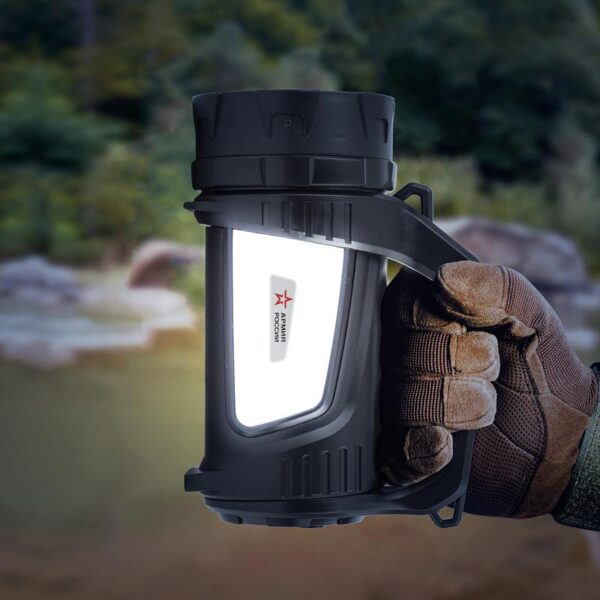 ЭРА Армия России "Шмель" РА-702 — мощный аккумуляторный фонарь-прожектор с дальностью светового луча почти в полкилометра. 7 режимов работы! Яркие светодиоды последнего поколения. Помимо основного освещения разной яркости, есть два боковых светильника, а также красный аварийный свет. Режимы можно комбинировать, находя лучший вариант освещения для каждой конкретной ситуации.