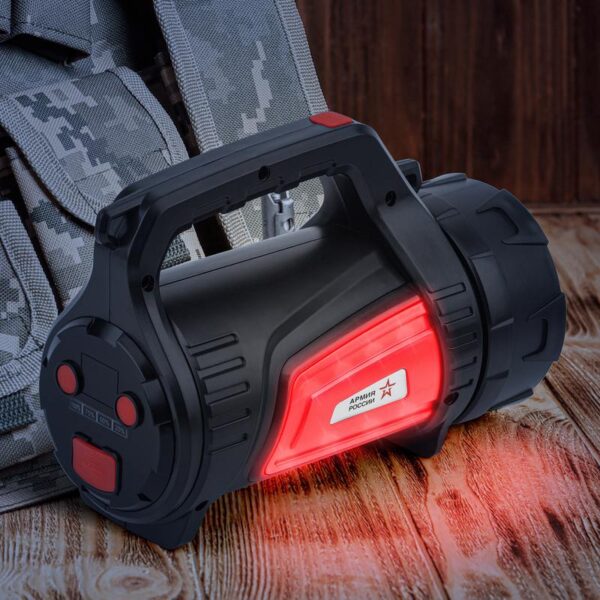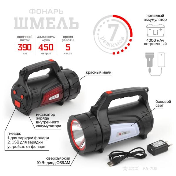 Характеристики Светодиодный фонарь АРМИЯ РОССИИ PA-702 Шмель прожекторный аккумуляторный красный маяк боковой свет powerpank: