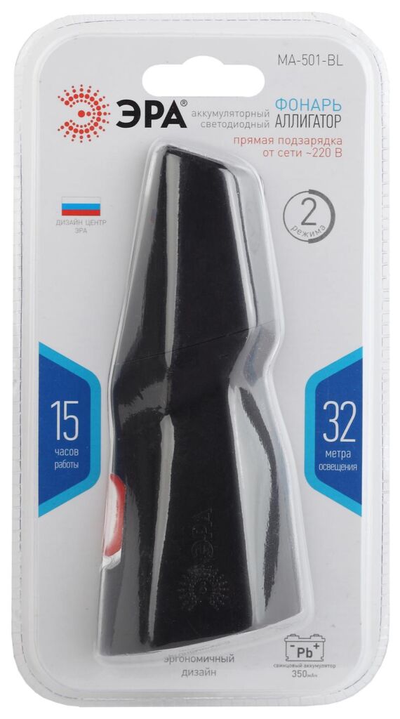 ЭРА MA-501 Аллигатор — удобный ручной фонарь собственной разработки ЭРА. Поставляется в презентабельной коробке, демонстрирующей необычный дизайн устройства. Эргономичный корпус имеет несколько граней. Фонарь отлично лежит в руке, яркая кнопка включения расположена прямо под большим пальцем. ЭРА МА-501 напрямую заряжается от электросети 220 В — не нужно брать с собой ни батарейки, ни провода для подзарядки. Вилка встроена прямо в корпус, достаточно просто снять с неё специальную защитную крышку и вставить фонарь в розетку. От одной подзарядки прибор проработает без перерыва 15 часов этого с запасом хватит на целую ночь или многодневное путешествие, если включать фонарь на несколько часов по вечерам.