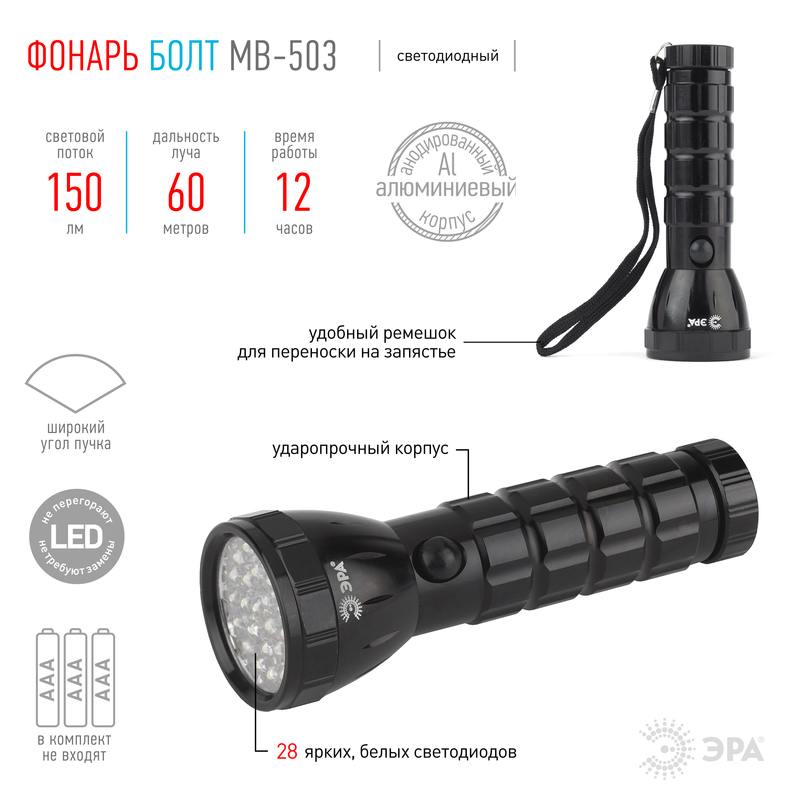 Характеристики Светодиодный фонарь ЭРА MB-503 ручной на батарейках алюминиевый: