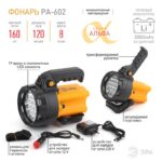 Аккумуляторный светодиодный прожектор PA-602 — это надёжный инструмент в ситуациях, когда необходим мощный и качественный поток света. Фонарь оснащён мощным аккумулятором и способен работать без подзарядки 8 часов. Заряжать его очень просто, можно от обычной сети в 220V, а можно от бортовой сети автомобиля в 12V. Фонарь комплектуется ремнём для переноски на плече.Фонарь обеспечивает качественный мощный белый свет дальностью 120 метров. Оборудован компасом на корпусе. А сам корпус выполнен из ударопрочного пластика.Обычно при выборе мощного фонаря параметры, определяющие комфорт в использовании отходят на второй план, уступая по приоритетам характеристикам надёжности и долговечности. К тому же ёмкостная батарея обычно занимает очень много места. В прожекторе PA-602 параметры комфорта и практичности соединены вместе. Эргономичная ручка и относительно габаритные размеры позволяют взять с собой мощный источник света даже в длительный поход. При этом прочный корпус и качественные светодиоды гарантируют, что такой прожектор прослужит длительное время.