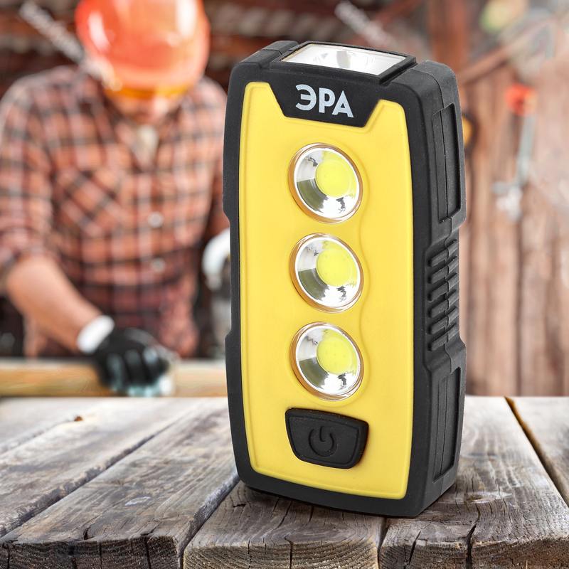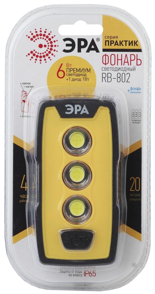 ЭРА RB-802 яркий светодиодный фонарь, который не боится воды (IP65 — защита от дождя и брызг). По периметру корпуса — прорезиненное покрытие, которое защищает устройство при возможных падениях и тряске. На лицевой стороне — 3 премиум-светодиода общей мощностью 6 Вт. Каждый из них расположен в индивидуальном гнезде — в случае повреждения одного из элементов, пользователь не останется без света. На торце — дополнительный LED-элемент мощностью 1 Вт. RB-802 можно использовать в двух режимах: направленный свет (фонарь с дальностью 20 метров) и рассеянный заливающий свет (светильник). Встроены три вида крепления к разным поверхностям — крючок, магнит и клипса. ЭРА RB-802 непрерывно работает без подзарядки в течение 4 часов.