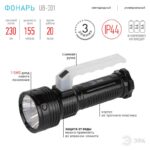 ЭРА UB-301 — компактный светодиодный фонарь с удобной съёмной ручкой, защитой от воды и 3 режимами работы: максимальная яркость, 50% яркости, стробирование. В основе SMD-диод нового поколения — не тускнеет и не требует замены с течением времени. Ручной портативный фонарь от ЭРА работает от 3 пальчиковых батареек (3 х АА, в комплект не входят). После установки новых элементов питания непрерывно светит 20 часов. Обеспечивает 155 метров освещения! Повышенный световой поток — 230 Лм. Можно применять во влажном климате, в любую погоду — IP44. Станет вашим надежным помощником в любой ситуации!