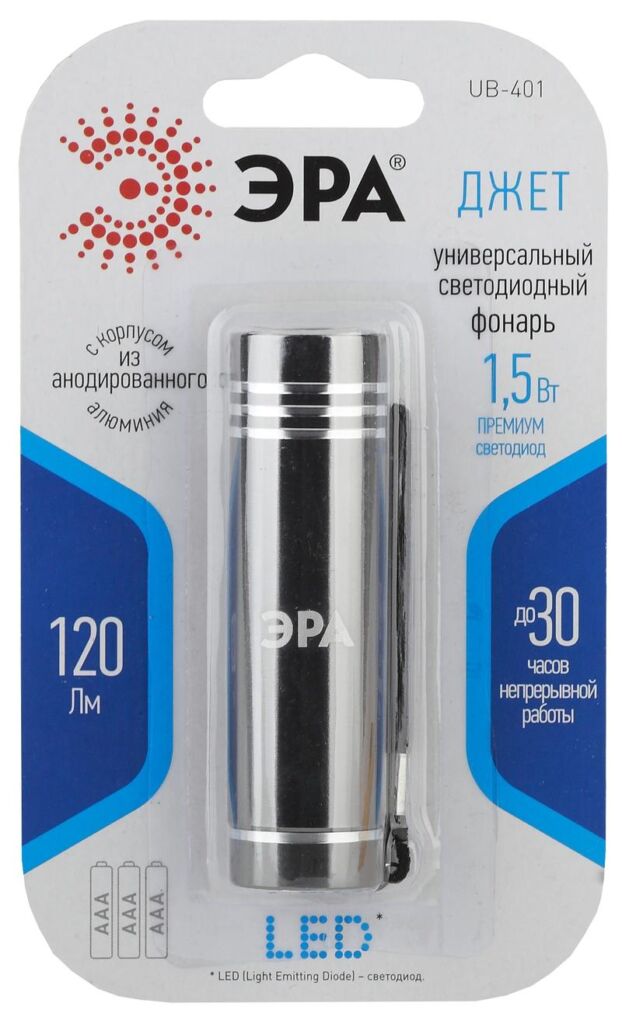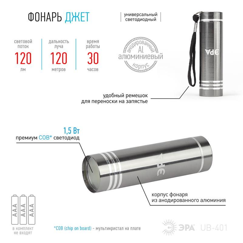 Характеристики Светодиодный фонарь ЭРА UB-401 Джет ручной на батарейках алюминиевый: