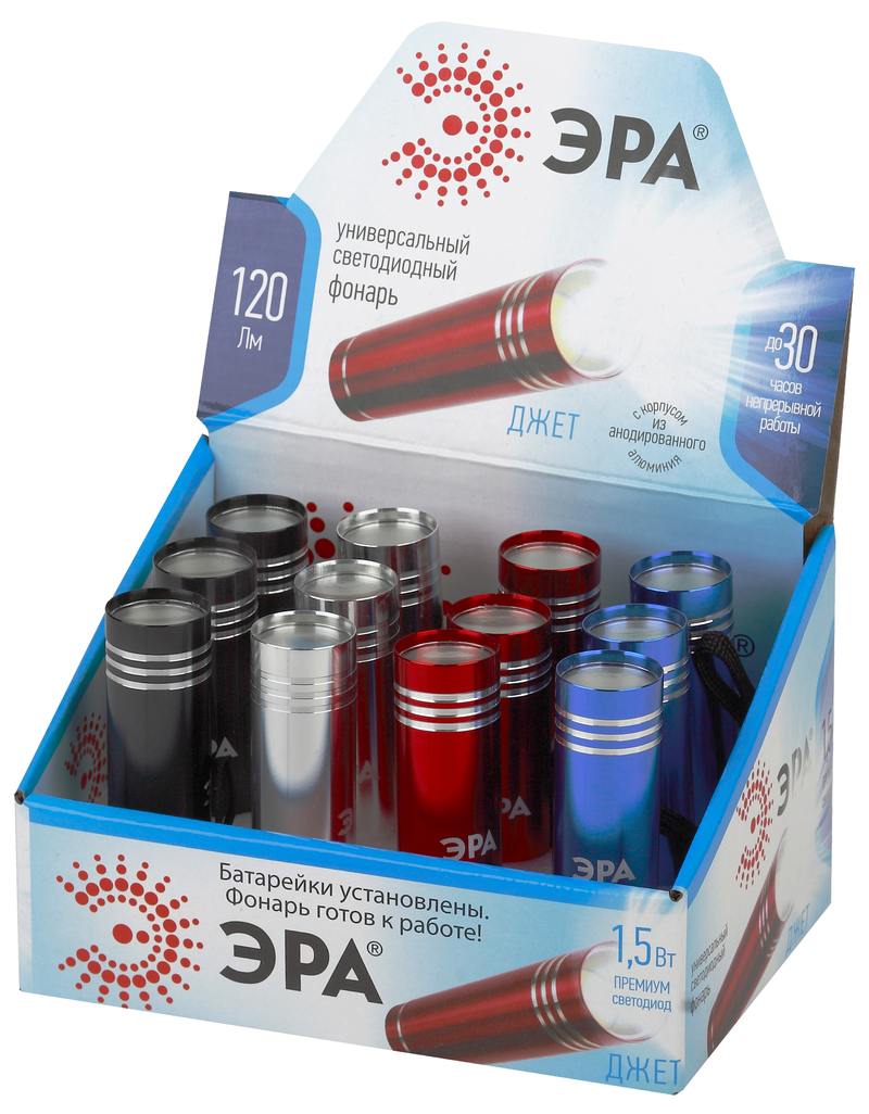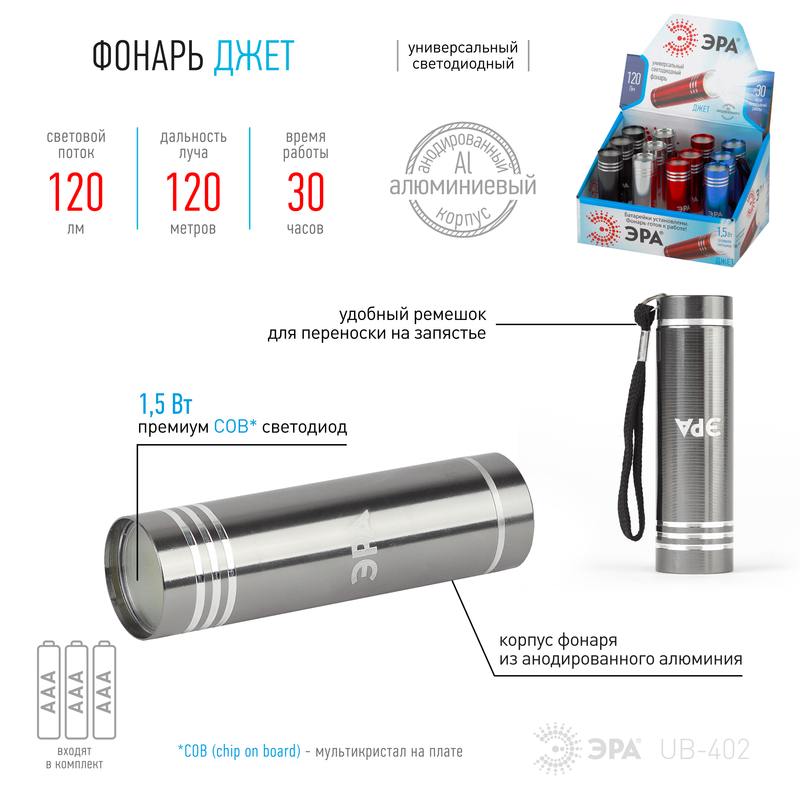 Характеристики Светодиодный фонарь ЭРА UB-402 Джет ручной на батарейках промо-бокс 12шт алюминиевый: