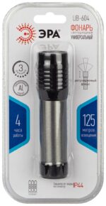 ЭРА UB-604 – ручной LED-фонарь с регулируемой фокусировкой луча. Мощность светодиодного фонаря – 5 Вт. Удобно использовать как кемпинговый фонарь, рабочий фонарь. Отличный вариант подарка для мужчины. Этот влагозащищённый фонарь (IP44) можно успешно применять на улице. Светодиодный ручной фонарь ЭРА UB-604 работает от 3 мизинчиковых батареек (ААА). В фонаре установлен мощный яркий светодиод с дальностью света до 125 метров. Световой поток – 415 Лм. Для разных ситуаций применения предусмотрены 3 режима работы: максимальная яркость, 50% яркости, стробирование.