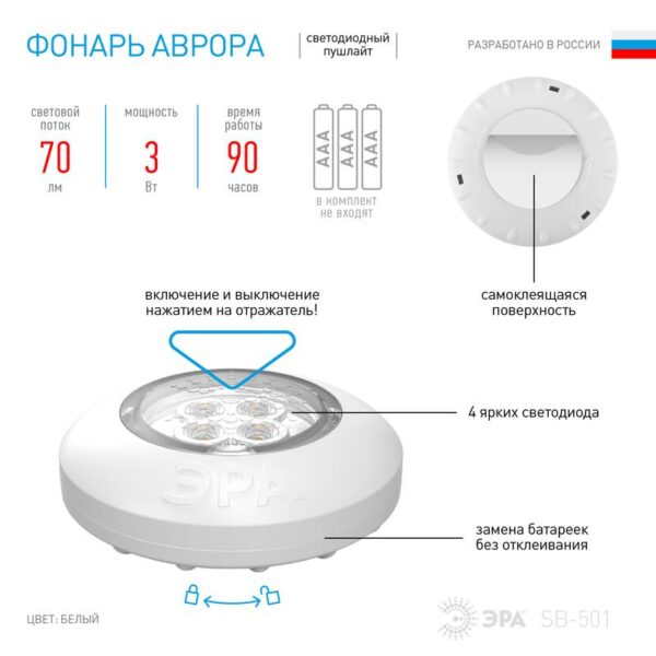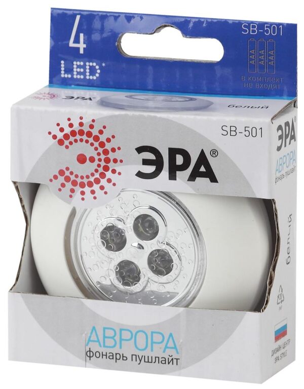 Фонарь SB-501 Аврора — компактный самоклеящийся фонарь-подсветка, который включается простым нажатием на корпус. Устанавливается очень просто — достаточно отклеить стикер от самоклеящейся поверхности и приклеить прибор туда, где требуется дополнительное освещение. 4 белых светодиода нового поколения светят мягким ровным светом, не мерцают, не нагреваются и имеют длительный срок службы. Дальность луча — 5 метров. Этот удобный и практичный фонарь можно с успехом использовать для декоративного освещения, в качестве подсветки или как аварийный свет. Благодаря лаконичному универсальному дизайну и базовому цвету корпуса фонарь подойдет к любому интерьеру. ЭРА SB-501 используется на лестницах, в коридорах, прихожих, кладовках, в шкафах и тумбочках. Подходит для машин, лодок и кемпинга. Работает от 3 мизинчиковых батареек, которые легко сменить, не отклеивая фонарь, а просто открутив верхнюю часть корпуса.