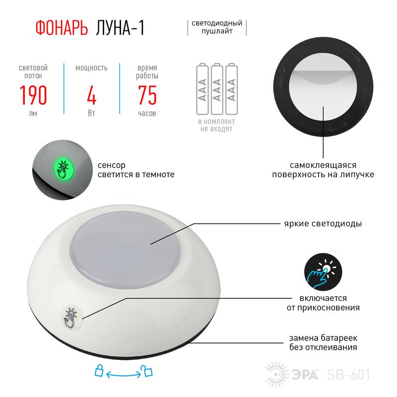 Характеристики Светодиодный фонарь подсветка ЭРА Пушлайт SB-601 Луна-1 с сенсорным выключателем:
