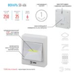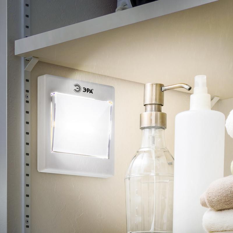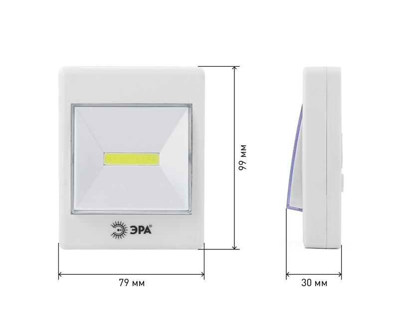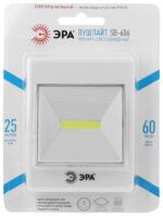 ЭРА SB-606 — компактный светодиодный фонарь-пушлайт, работающий по принципу традиционного выключателя. Создан для освещения помещений без стационарного света и для дополнительной подсветки затемнённых мест. Сверхъяркий и суперэкономичный свет chip on board — мультикристалл на плате. Широкий угол светового пучка даёт качественное заливающее освещение. Быстрое закрепление на любой гладкой поверхности, удобное включение и простота в управлении. Чтобы закрепить фонарь на любую ровную поверхность, потребуется всего минута. Самоклеящаяся основа и само устройство соединяются друг с другом при помощи прочной липучки. Это даёт большое преимущество при последующих заменах батареек — фонарь легко снимается и снова закрепляется на текстильную застёжку. Имеется и дополнительный вариант крепления — углубление для подвешивания на шуруп или гвоздь. В самом центре выключателя расположена LED-плата с целым рядом мелких и очень ярких светодиодов. это промышленная технология, адаптированная для универсальных целей. Получился яркий, но при этом ровный мягкий свет, идеальный для бытовой подсветки. LED-мультикристаллы не тускнеют со временем и не нуждаются в замене. Они обеспечивают максимально широкий угол освещения с дальностью 25 метров. Фонарь-пушлайт ЭРА SB-606 идеален для подсветки полок шкафов и ящиков комодов, для дополнительной подсветки кухонных рабочих поверхностей, для освещения подсобок. Устройство экономично — от одного комплекта батареек (3хААА) работает свыше 60 активных часов.