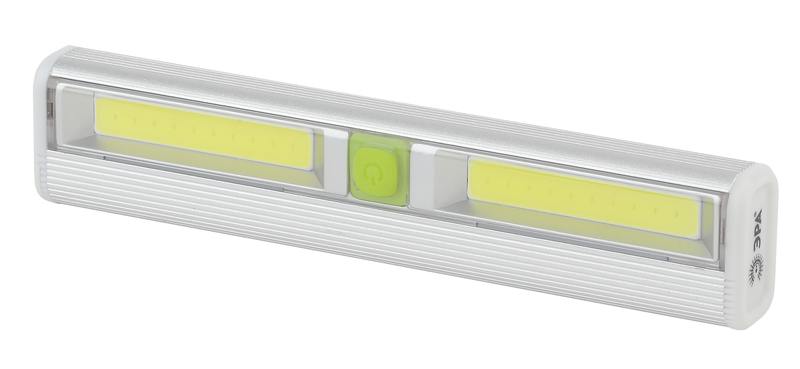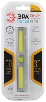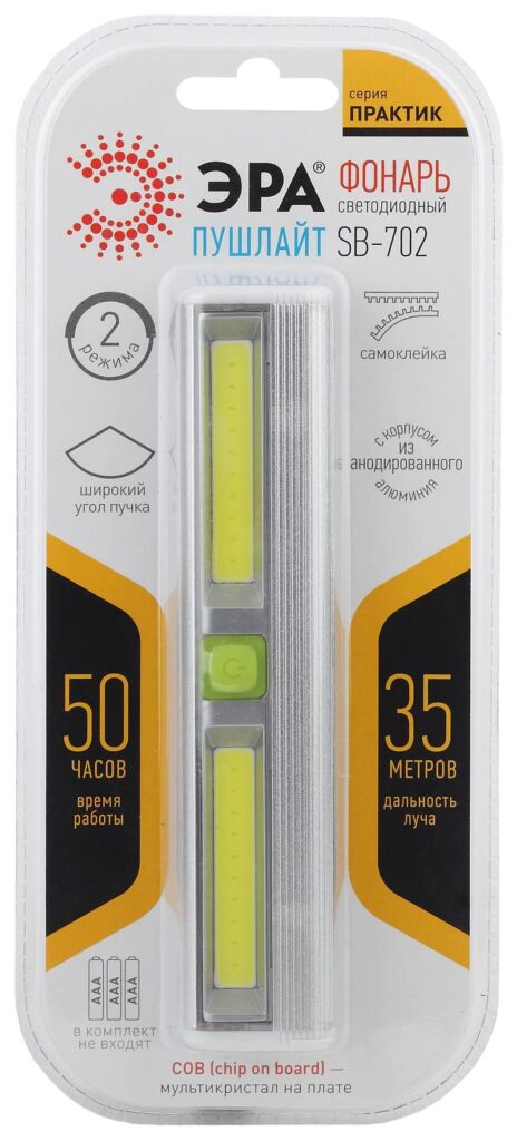 SB-702 — светодиодный фонарь-пушлайт с двумя режимами работы и несколькими типами креплений — самоклеющаяся основа, магнит, два отверстия для подвешивания на болты/гвозди. Прочный корпус из анодированного алюминия. Широкий угол светового пучка. Яркий заливающий свет, который не слепит глаза и не мерцает. Компактный фонарь-пушлайт легко крепится к любой гладкой поверхности и становится отличным решением для освещения пространств, где нет стационарного света, или для дополнительной подсветки затемнённых мест. ЭРА SB-702 размещают в подсобных помещениях, на отдалённых полках гардеробных, под кухонными шкафами. Он включается и отключается быстрым нажатием на кнопку, расположенную в центре корпуса. Повторное нажатие кнопки активирует эконом-режим с 30% яркости. Кнопка включения покрыта мягким прорезиненным материалом, препятствующим скольжению. Даёт широкое заливающее освещение при помощи двух светодиодных пластин СОВ (chip on board — мультикристал на плате), это промышленная технология, адаптированная для универсальных целей. Получился яркий, но при этом ровный мягкий свет, идеальный для бытовой подсветки. LED-платы не тускнеют со временем и не нуждаются в замене. Для того, чтобы закрепить фонарь в любом удобном месте, нужно просто отсоединить защитную плёнку и приклеить устройство с помощью прочной самоклеющейся основы. Одна минута — и вы обеспечены качественной подсветкой! На металлические поверхности ЭРА SB-702 крепится и вовсе за считанные секунды — в корпус встроен магнит. Устройство экономично — от одного комплекта батареек (3хААА) работает 50 активных часов.