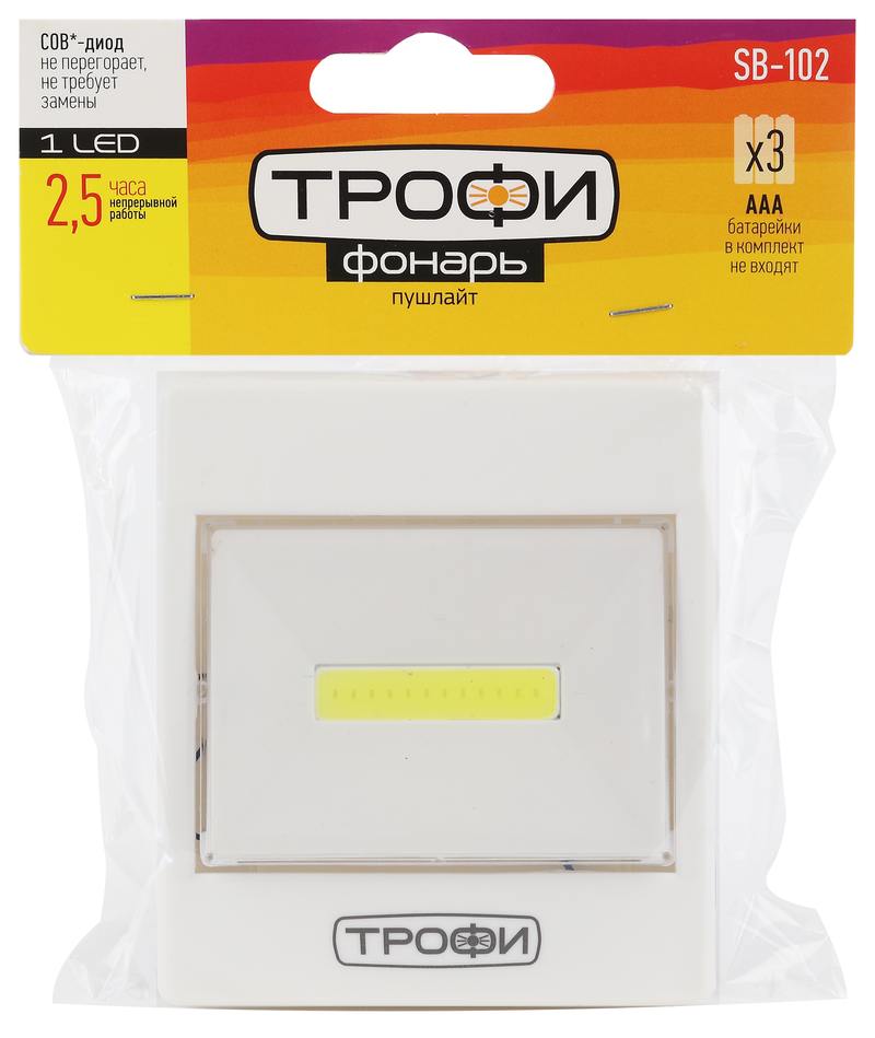 Характеристики Светодиодный фонарь подсветка Трофи SB-102 пушлайт, [СОВ, 3хААА, белый, 1шт в пакете]: