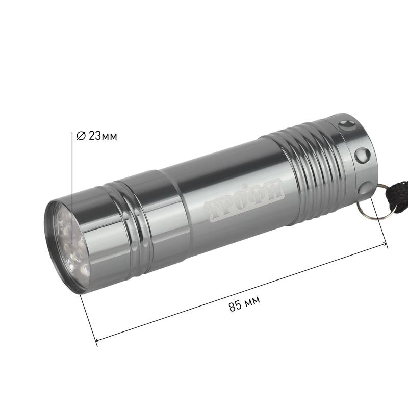 Трофи TM9 — компактный и простой в управлении LED-фонарь с 9 белыми светодиодами и корпусом из прочного анодированного алюминия. От одного комплекта алкалиновых батареек непрерывно работает 30 часов. Лаконичный дизайн. Металлический карманный фонарик для самых разных целей. Всегда под рукой, когда нужно что-то оперативно подсветить. В комплекте мягкий прочный ремешок для удобной переноски фонаря на запястье. Корпус изготовлен из анодированного алюминия. Это прочный материал, устойчивый к возникновению царапин и сколов при возможных падениях и ударах. Трофи ТМ9 прослужит долго и сохранит свой приятный внешний вид даже спустя годы использования. Яркий ровный свет обеспечивают 9 современных белых светодиодов. Они не перегорают, не тускнеют со временем и не нуждаются в замене. При этом очень экономичны — от одного комплекта алкалиновых батареек (3хААА) фонарь непрерывно работает 30 часов! Дальность светового луча — более 15 метров.