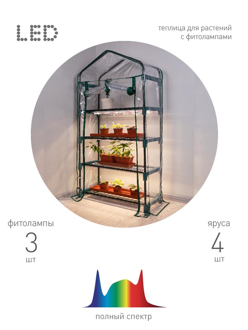 Характеристики Теплица ЭРА FITO-House — 4 со светильниками в комплекте 4 яруса 1250х690х300 мм: